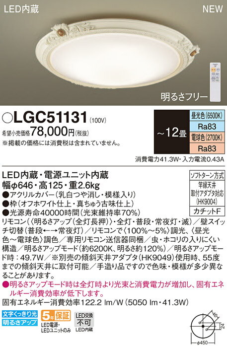 商 品 詳 細商品名インテリア 屋内 照明メーカー名パナソニック Panasonicメーカー器具名称シーリングライト(天井照明)仕様光源◆LED(昼光色6500K・Ra83/電球色2700K・Ra83)◆色温度:6500 K◆光源寿命40000時間(光束維持率70%)寸法・質量◆幅:φ646 mm◆高:125 mm◆質量:2.6 kg仕様・注意事項LED照明の安心品質◆器具光束:5050 lm◆電圧:100 V◆消費電力:41.3 W◆消費効率:122.2 lm/W◆畳数:〜12畳◆デザイン分類:Modern Classic◆【アクリルカバー】乳白つや消し・模様入り◆【枠】オフホワイト仕上・真ちゅう古味仕上◆昼光色Ra83◆電球色Ra83◆リモコン(〈明るさアップ(全灯長押)〉・全灯・普段・常夜灯・滅)◆壁スイッチ切替(普段←→常夜灯)◆リモコンで〈100%〜5%〉調光、〈昼光色〜電球色〉調色◆専用リモコン送信器同梱◆虫・ホコリの入りにくい構造◆明るさアップモード(約6200K、明るさ約120%)◆明るさアップモード時:49.7W◆※別売の傾斜天井アダプタ(HK9049)使用時、55度までの傾斜天井に取付可能◆手造り品ですので色味・模様が多少異なることがあります。